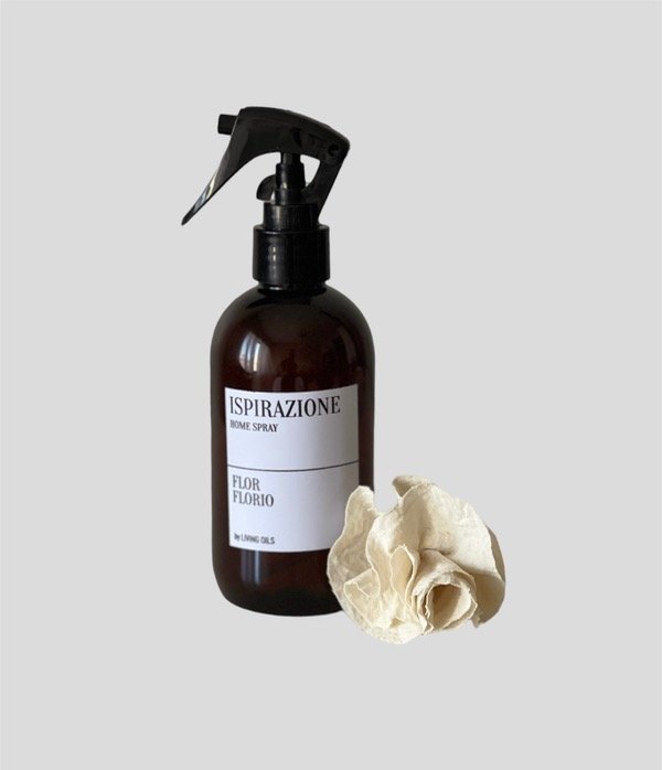 1 Home Spray Ispirazione y una flor de tela perfumada. Envase PET ámbar con válvula atomizadora 200ml. Apto TEXTIL