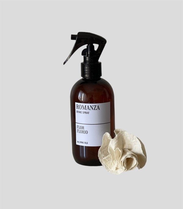 Home Spray apto textil en envase PET 250 ml con válvula atomizadora, incluye flor de tela. Bolsa negra friselina. Fragancia Romanza: perfume floral dulce, intenso y envolvente. Nota de salida violetas, corazón de bergamota, higo, base maderas, vainilla y ámbar.