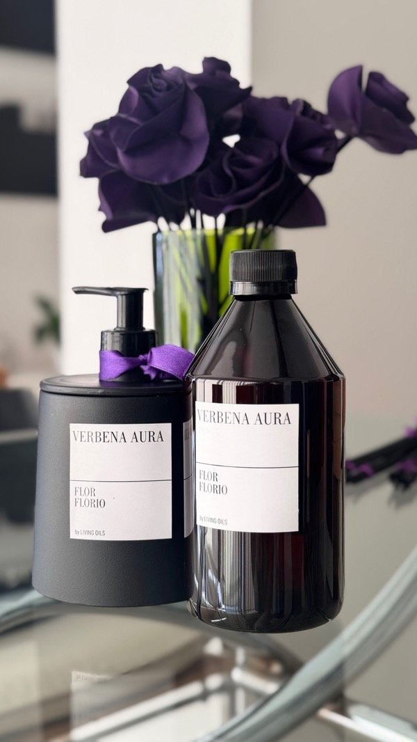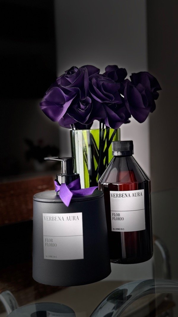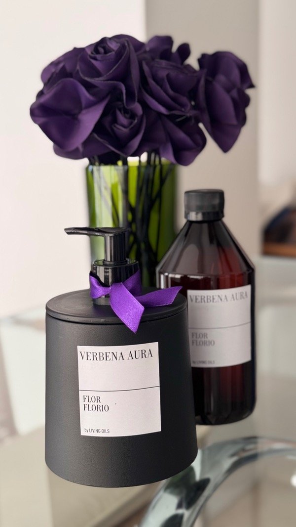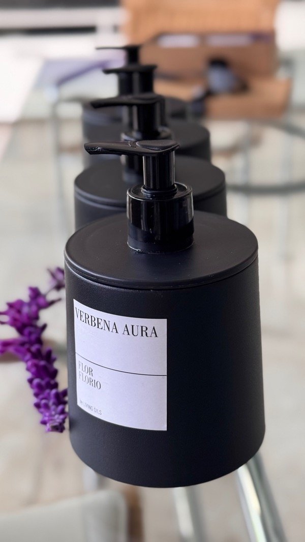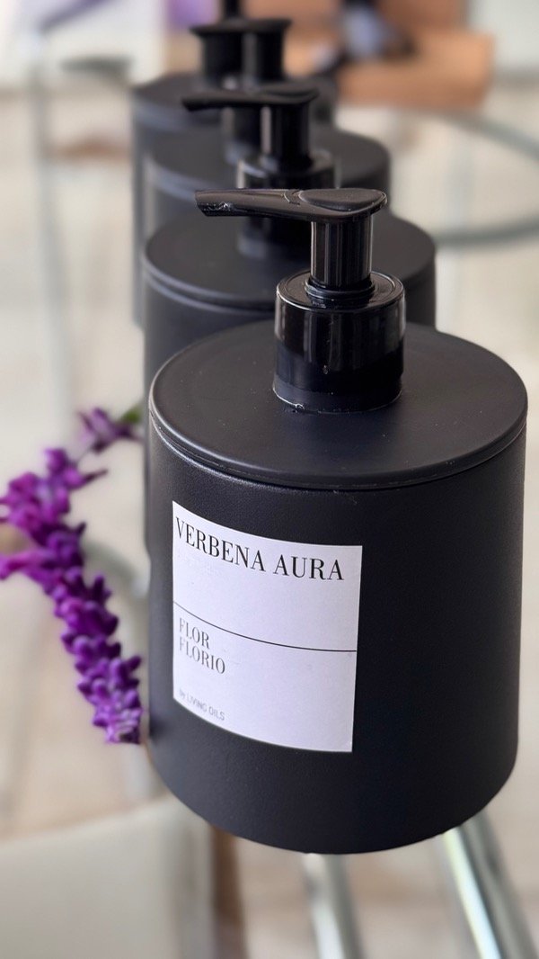 Envase Refil 500 ml de jabón líquido fragancia Verbena Aura acompañado por Dispenser de jabón, para rellenar y. reutilizar con tus fragancias preferidas. El envase dispenser con válvula es de material plástico reciclado.